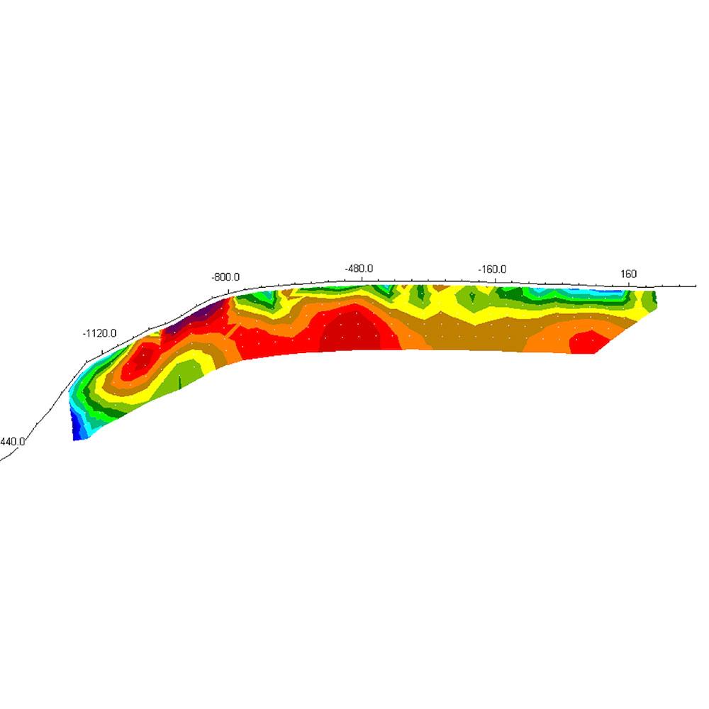 ERT (Electrical Resistivity Tomography) measures the electrical resistance of underground materials. By sending electrical currents into the ground, it generates a detailed 2D or 3D image of subsurface conditions.
